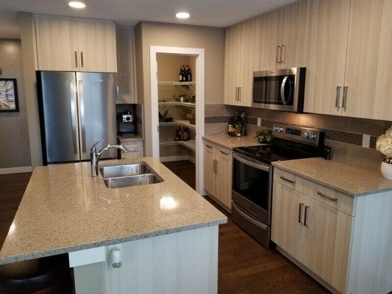 - Quartz Countertops in Kitchen with Under Mount Sink & Eating Bar Ledge